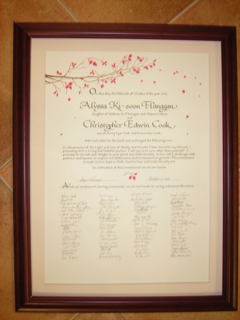 ![]() Wedding certificate in wood frame. |